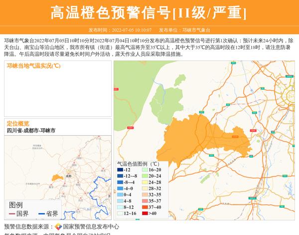 邛崃市气象台更新高温橙色预警信号[II级/严重] 相关文章