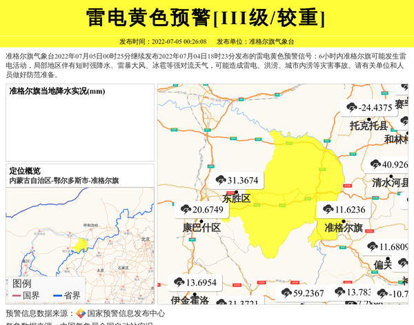 准格尔旗气象台2022年07月05日00时25分继续发布2022年07月04日18时23分发布的雷电黄色预警信号:6小时内准格尔旗可能发生雷电活动,局部地区伴有短时强降水、雷暴大风、冰雹等强对流天气,可能造成雷电、洪涝、城市内涝等灾害事故。请有关单位和人员做好防范准备。 信息来源:国家预警信息发布中心; 发布单位:准格尔旗气象台。
