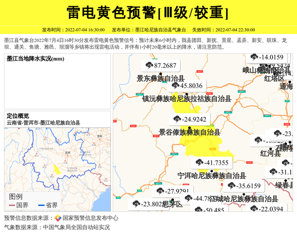 墨江县气象台2022年7月4日16时30分发布雷电黄色预警信号:预计未来6小时内,我县团田、新抚、景星、孟弄、新安、联珠、龙坝、通关、鱼塘、雅邑、坝溜等乡镇将出现雷电活动,并伴有1小时20毫米以上的降水,请注意防范。 信息来源:国家预警信息发布中心; 发布单位:墨江哈尼族自治县气象台。