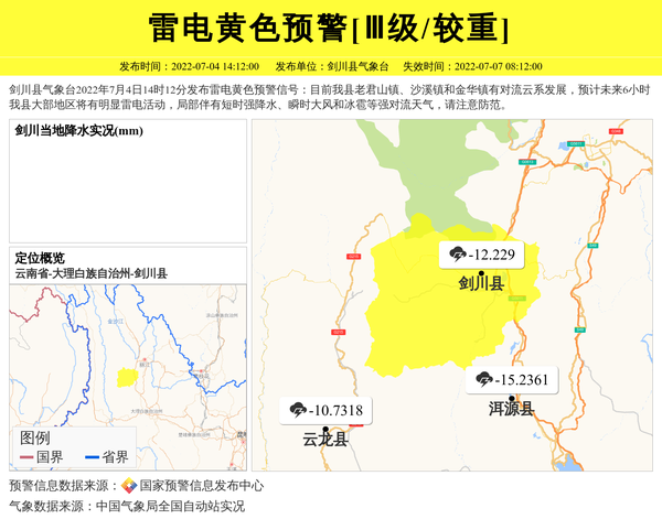 剑川县气象台2022年7月4日14时12分发布雷电黄色预警信号:目前我县老君山镇、沙溪镇和金华镇有对流云系发展,预计未来6小时我县大部地区将有明显雷电活动,局部伴有短时强降水、瞬时大风和冰雹等强对流天气,请注意防范。 信息来源:国家预警信息发布中心; 发布单位:剑川县气象台。