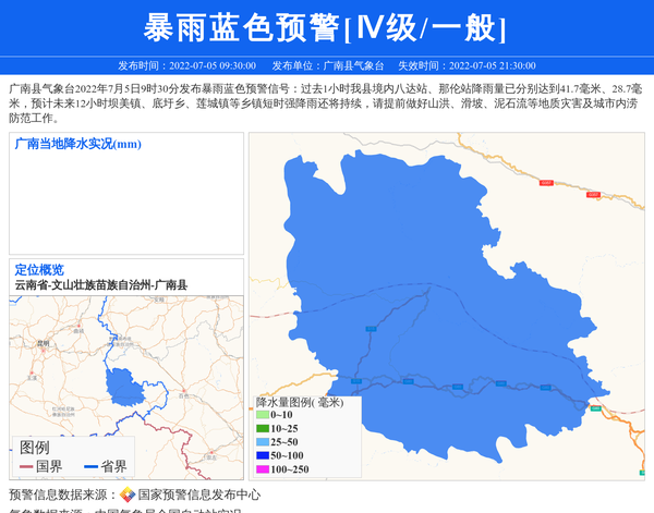 广南县气象台2022年7月5日9时30分发布暴雨蓝色预警信号:过去1小时我县境内八达站、那伦站降雨量已分别达到41.7毫米、28.7毫米,预计未来12小时坝美镇、底圩乡、莲城镇等乡镇短时强降雨还将持续,请提前做好山洪、滑坡、泥石流等地质灾害及城市内涝防范工作。 信息来源:国家预警信息发布中心; 发布单位:广南县气象台。