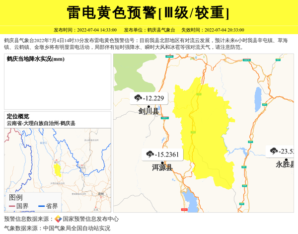 鹤庆县气象台发布雷电黄色预警[Ⅲ级/较重]