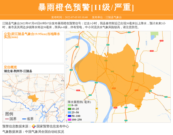 江陵县气象台2022年07月05日05时07分发布暴雨橙色预警信号:过去1小时,我县秦市附近已出现30毫米以上降水,预计未来2小时,秦市及其周边乡镇降水将达50毫米,阵风6-8级,伴有雷电,中小河流洪水气象风险较高,请注意防范。 信息来源:国家预警信息发布中心; 发布单位:江陵县气象台。