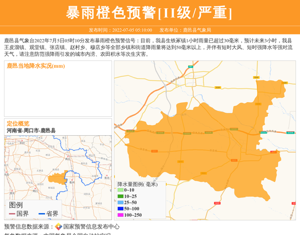 鹿邑县气象台2022年7月5日05时10分发布暴雨橙色预警信号:目前,我县生铁冢镇1小时雨量已超过30毫米,预计未来3小时,我县王皮溜镇、观堂镇、张店镇、赵村乡、穆店乡等全部乡镇和街道降雨量将达到50毫米以上,并伴有短时大风、短时强降水等强对流天气,请注意防范强降雨引发的城市内涝、农田积水等次生灾害。 信息来源:国家预警信息发布中心; 发布单位:鹿邑县气象局。