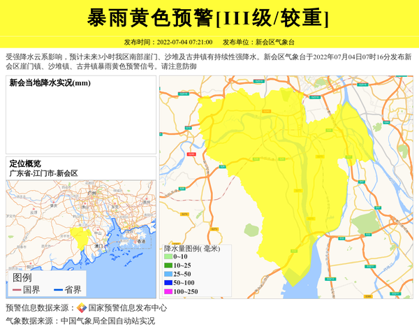 受强降水云系影响,预计未来3小时我区南部崖门、沙堆及古井镇有持续性强降水。新会区气象台于2022年07月04日07时16分发布新会区崖门镇、沙堆镇、古井镇暴雨黄色预警信号。请注意防御 信息来源:国家预警信息发布中心; 发布单位:新会区气象台。