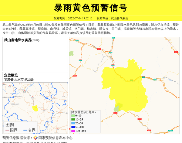 武山县气象台2022年07月04日19时02分发布暴雨黄色预警信号:目前,我县鸳鸯镇1小时降水量已达到30毫米,降水仍在持续,预计未来1小时,我县高楼镇、鸳鸯镇、山丹镇、城关镇、洛门镇、榆盘镇、咀头乡、四门镇、温泉镇等乡镇将出现30毫米以上的降水,发生山洪、山体滑坡等灾害的气象风险高,请有关单位和乡镇及时采取防范措施。 信息来源:国家预警信息发布中心; 发布单位:武山县气象台。