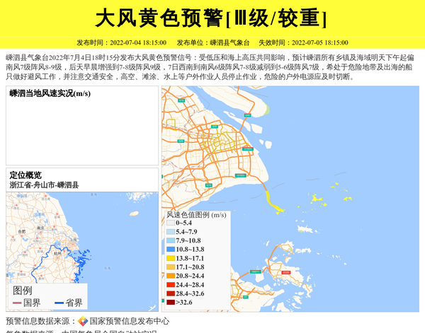 嵊泗县气象台2022年7月4日18时15分发布大风黄色预警信号:受低压和海上高压共同影响,预计嵊泗所有乡镇及海域明天下午起偏南风7级阵风8-9级,后天早晨增强到7-8级阵风9级,7日西南到南风6级阵风7-8级减弱到5-6级阵风7级,希处于危险地带及出海的船只做好避风工作,并注意交通安全,高空、滩涂、水上等户外作业人员停止作业,危险的户外电源应及时切断。 信息来源:国家预警信息发布中心; 发布单位:嵊泗县气象台。
