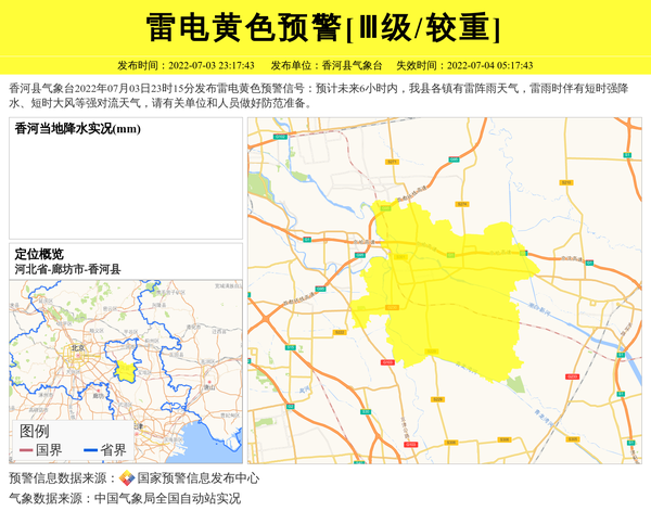香河县气象台2022年07月03日23时15分发布雷电黄色预警信号:预计未来6小时内,我县各镇有雷阵雨天气,雷雨时伴有短时强降水、短时大风等强对流天气,请有关单位和人员做好防范准备。 信息来源:国家预警信息发布中心; 发布单位:香河县气象台。