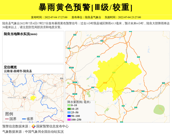 陆良县气象台2022年7月4日17时27分发布暴雨黄色预警信号:过去1小时我县城区降雨43.5毫米,预计未来6小时,陆良大部降雨将达50毫米以上,请注意防范局部洪涝和地质灾害。 信息来源:国家预警信息发布中心; 发布单位:陆良县气象台。