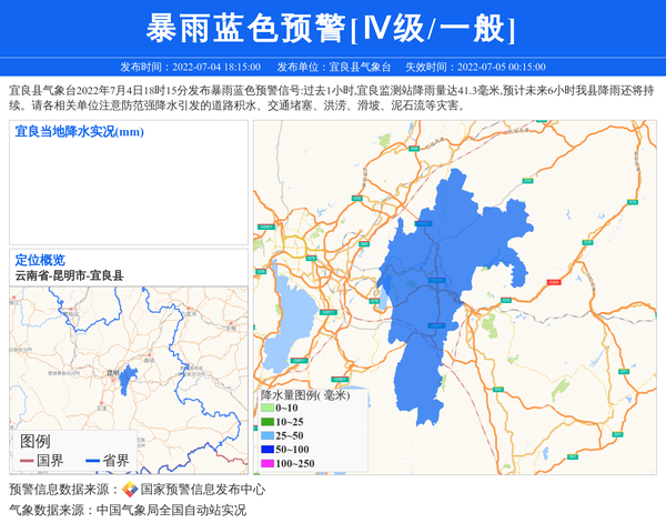 宜良县气象台2022年7月4日18时15分发布暴雨蓝色预警信号:过去1小时,宜良监测站降雨量达41.3毫米,预计未来6小时我县降雨还将持续。请各相关单位注意防范强降水引发的道路积水、交通堵塞、洪涝、滑坡、泥石流等灾害。 信息来源:国家预警信息发布中心; 发布单位:宜良县气象台。