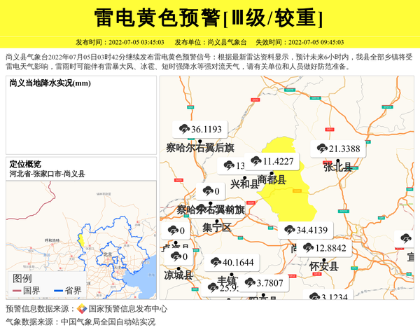 尚义县气象台2022年07月05日03时42分继续发布雷电黄色预警信号:根据最新雷达资料显示,预计未来6小时内,我县全部乡镇将受雷电天气影响,雷雨时可能伴有雷暴大风、冰雹、短时强降水等强对流天气,请有关单位和人员做好防范准备。 信息来源:国家预警信息发布中心; 发布单位:尚义县气象台。