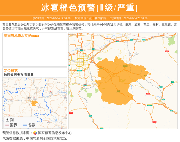 蓝田县气象台2022年07月04日14时20分发布冰雹橙色预警信号:预计未来6小时内我县华胥、曳湖、孟村、前卫、安村、三里镇、蓝关等镇街可能出现冰雹天气,并可能造成雹灾,请注意防范。 信息来源:国家预警信息发布中心; 发布单位:蓝田县气象局。