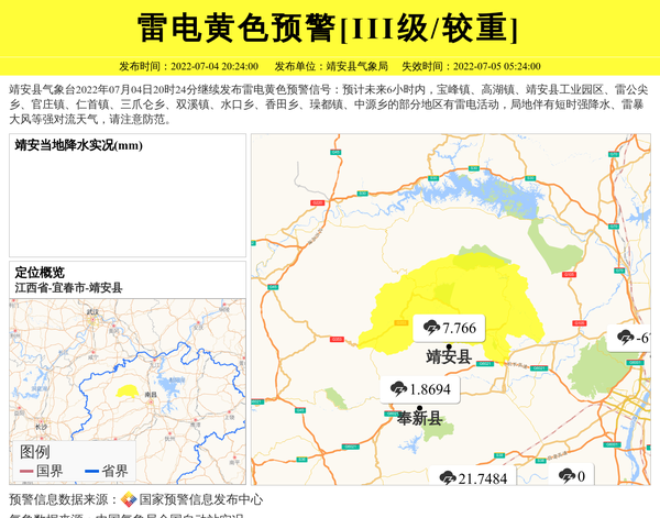 靖安县气象台2022年07月04日20时24分继续发布雷电黄色预警信号:预计未来6小时内,宝峰镇、高湖镇、靖安县工业园区、雷公尖乡、官庄镇、仁首镇、三爪仑乡、双溪镇、水口乡、香田乡、璪都镇、中源乡的部分地区有雷电活动,局地伴有短时强降水、雷暴大风等强对流天气,请注意防范。 信息来源:国家预警信息发布中心; 发布单位:靖安县气象局。