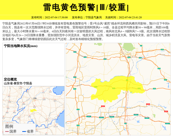 宁阳县气象局2022年07月04日17时30分继续发布雷电黄色预警信号:受3号台风“暹芭”残余环流和西风槽共同影响,预计5日下午到6日白天,我县有一次大范围强降水过程,并伴有雷电,雷雨地区雷雨时阵风8~10级。全县过程平均降水量50~90毫米,局部100毫米以上,最大小时降水量50~80毫米。6日白天到夜间有一次较明显的大风过程,南风转北风4~5级阵风7~8级。此次强降水过程部分地区与6月26~28日强降水重叠,需加强防范中小河流洪水、地质灾害、山洪、城乡积涝及大风、雷电等灾害。由于当前天气形势复杂多变,气象部门将继续密切跟踪此次天气过程,及时发布精细化预报预警。 信息来源:国家预警信息发布中心; 发布单位:宁阳县气象局。