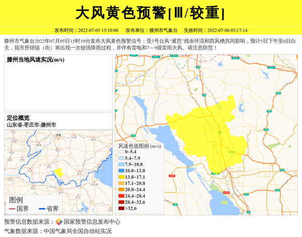 滕州市气象台2022年07月05日15时10分发布大风黄色预警信号:受3号台风“暹芭”残余环流和西风槽共同影响,预计5日下午至6日白天,我市所辖镇(街)将出现一次较强降雨过程,并伴有雷电和7~9级雷雨大风。请注意防范! 信息来源:国家预警信息发布中心; 发布单位:滕州市气象台。