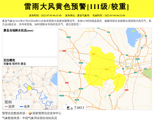 萧县气象台2022年07月05日06时52分发布雷雨大风黄色预警信号。未来6小时内我县新庄、杨楼等部分乡镇将出现雷雨大风天气,风力达8级左右,并伴有雷电、短时强降水等强对流天气。请注意防范! 信息来源:国家预警信息发布中心; 发布单位:萧县气象局。