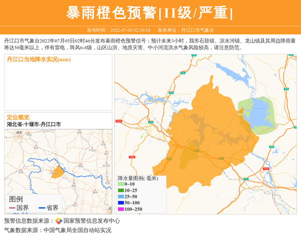 丹江口市气象台2022年07月05日02时46分发布暴雨橙色预警信号:预计未来3小时,我市石鼓镇、凉水河镇、龙山镇及其周边降雨量将达50毫米以上,伴有雷电,阵风6-8级,山区山洪、地质灾害、中小河流洪水气象风险较高,请注意防范。 信息来源:国家预警信息发布中心; 发布单位:丹江口市气象台。