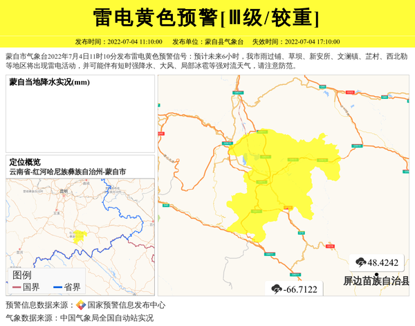 蒙自市气象台2022年7月4日11时10分发布雷电黄色预警信号:预计未来6小时,我市雨过铺、草坝、新安所、文澜镇、芷村、西北勒等地区将出现雷电活动,并可能伴有短时强降水、大风、局部冰雹等强对流天气,请注意防范。 信息来源:国家预警信息发布中心; 发布单位:蒙自县气象台。