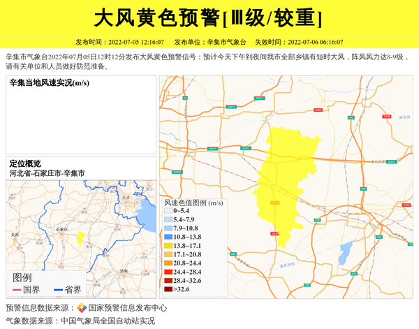 辛集市气象台2022年07月05日12时12分发布大风黄色预警信号:预计今天下午到夜间我市全部乡镇有短时大风,阵风风力达8-9级,请有关单位和人员做好防范准备。 信息来源:国家预警信息发布中心; 发布单位:辛集市气象台。