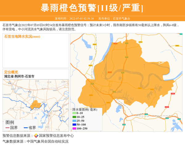 石首市气象台2022年07月05日02时54分发布暴雨橙色预警信号:预计未来3小时,我市南部乡镇将有50毫米以上降水,阵风6-8级,伴有雷电,中小河流洪水气象风险较高,请注意防范。 信息来源:国家预警信息发布中心; 发布单位:石首市气象台。