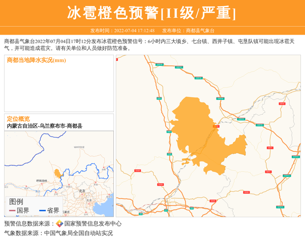 商都县气象台2022年07月04日17时12分发布冰雹橙色预警信号:6小时内三大顷乡、七台镇、西井子镇、屯垦队镇可能出现冰雹天气,并可能造成雹灾。请有关单位和人员做好防范准备。 信息来源:国家预警信息发布中心; 发布单位:商都县气象台。
