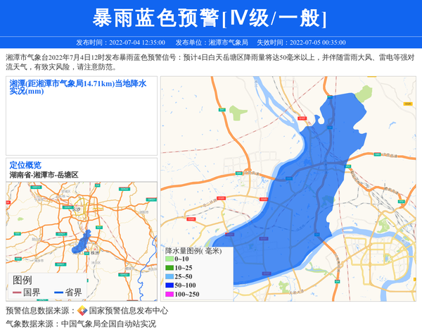 湘潭市气象台2022年7月4日12时发布暴雨蓝色预警信号:预计4日白天岳塘区降雨量将达50毫米以上,并伴随雷雨大风、雷电等强对流天气,有致灾风险,请注意防范。 信息来源:国家预警信息发布中心; 发布单位:湘潭市气象局。