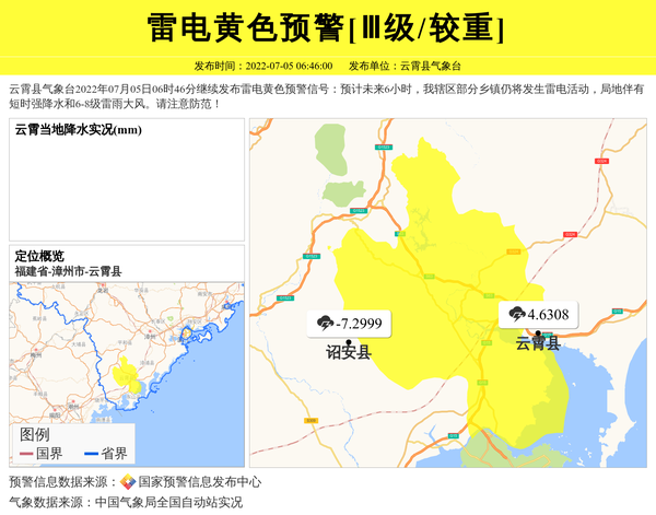 云霄县气象台2022年07月05日06时46分继续发布雷电黄色预警信号:预计未来6小时,我辖区部分乡镇仍将发生雷电活动,局地伴有短时强降水和6-8级雷雨大风。请注意防范! 信息来源:国家预警信息发布中心; 发布单位:云霄县气象台。