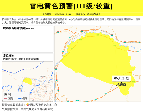 杭锦旗气象台2022年07月04日15时55分发布雷电黄色预警信号:6小时内杭锦旗可能发生雷电活动,局部地区伴有短时强降水、雷暴大风、冰雹等强对流天气。请有关单位和人员做好防范准备。 信息来源:国家预警信息发布中心; 发布单位:杭锦旗气象台。