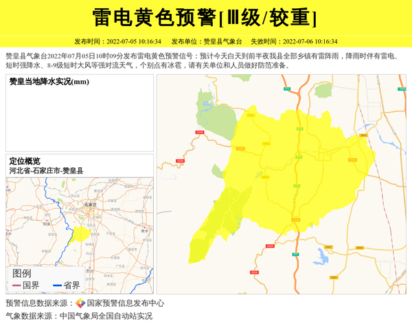 赞皇县气象台2022年07月05日10时09分发布雷电黄色预警信号:预计今天白天到前半夜我县全部乡镇有雷阵雨,降雨时伴有雷电、短时强降水、8-9级短时大风等强对流天气,个别点有冰雹,请有关单位和人员做好防范准备。 信息来源:国家预警信息发布中心; 发布单位:赞皇县气象台。