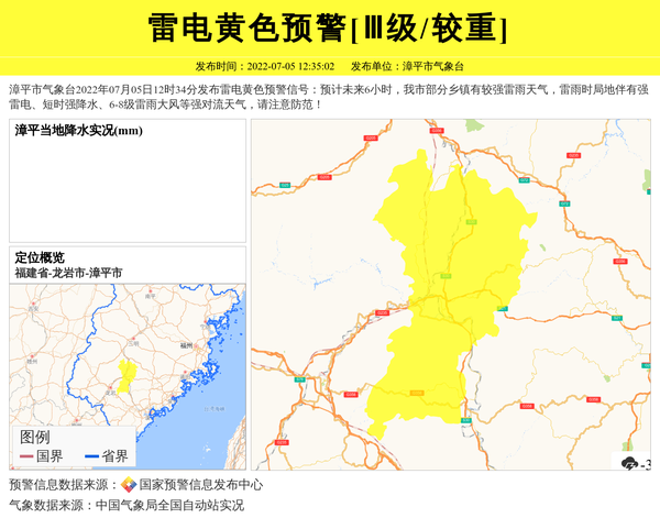 漳平市气象台2022年07月05日12时34分发布雷电黄色预警信号:预计未来6小时,我市部分乡镇有较强雷雨天气,雷雨时局地伴有强雷电、短时强降水、6-8级雷雨大风等强对流天气,请注意防范! 信息来源:国家预警信息发布中心; 发布单位:漳平市气象台。