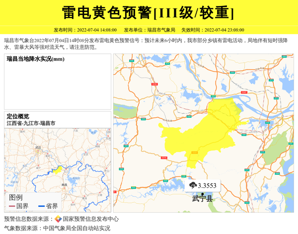 瑞昌市气象台2022年07月04日14时08分发布雷电黄色预警信号:预计未来6小时内,我市部分乡镇有雷电活动,局地伴有短时强降水、雷暴大风等强对流天气,请注意防范。 信息来源:国家预警信息发布中心; 发布单位:瑞昌市气象局。