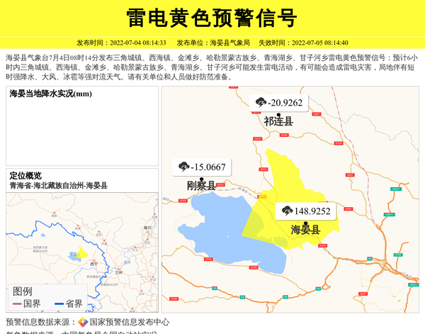 海晏县气象台7月4日08时14分发布三角城镇、西海镇、金滩乡、哈勒景蒙古族乡、青海湖乡、甘子河乡雷电黄色预警信号:预计6小时内三角城镇、西海镇、金滩乡、哈勒景蒙古族乡、青海湖乡、甘子河乡可能发生雷电活动,有可能会造成雷电灾害,局地伴有短时强降水、大风、冰雹等强对流天气。请有关单位和人员做好防范准备。 信息来源:国家预警信息发布中心; 发布单位:海晏县气象局。
