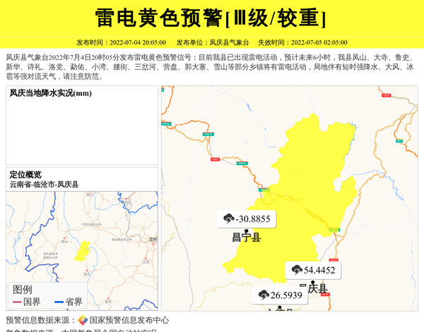 凤庆县气象台2022年7月4日20时05分发布雷电黄色预警信号:目前我县已出现雷电活动,预计未来6小时,我县凤山、大寺、鲁史、新华、诗礼、洛党、勐佑、小湾、腰街、三岔河、营盘、郭大寨、雪山等部分乡镇将有雷电活动,局地伴有短时强降水、大风、冰雹等强对流天气,请注意防范。 信息来源:国家预警信息发布中心; 发布单位:凤庆县气象台。