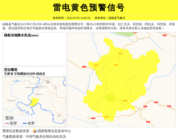碌曲县气象台2022年07月05日14时06分发布雷电黄色预警信号:预计6小时内郎木寺镇、拉仁关乡、双岔镇、阿拉乡、玛艾镇、尕海镇、西仓镇等部分地方可能发生雷电活动,局地可能伴有短时强降水、冰雹或阵性大风。请有关单位和人员做好防范准备! 信息来源:国家预警信息发布中心; 发布单位:碌曲县气象台。