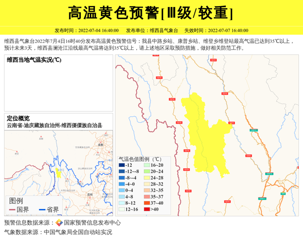 维西县气象台2022年7月4日16时40分发布高温黄色预警信号:我县中路乡站、康普乡站、维登乡维登站最高气温已达到35℃以上,预计未来3天,维西县澜沧江沿线最高气温将达到35℃以上,请上述地区采取预防措施,做好相关防范工作。 信息来源:国家预警信息发布中心; 发布单位:维西县气象台。