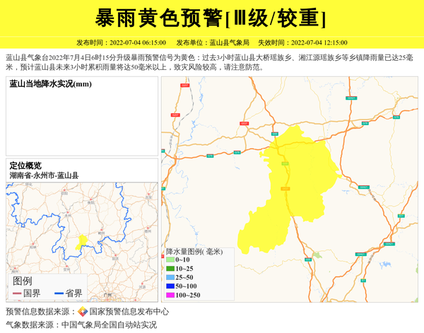 蓝山县气象台2022年7月4日6时15分升级暴雨预警信号为黄色:过去3小时蓝山县大桥瑶族乡、湘江源瑶族乡等乡镇降雨量已达25毫米,预计蓝山县未来3小时累积雨量将达50毫米以上,致灾风险较高,请注意防范。 信息来源:国家预警信息发布中心; 发布单位:蓝山县气象局。