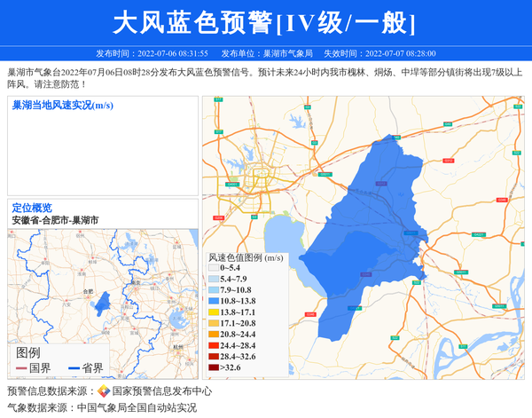 巢湖市气象台2022年07月06日08时28分发布大风蓝色预警信号。预计未来24小时内我市槐林、烔炀、中垾等部分镇街将出现7级以上阵风。请注意防范! 信息来源:国家预警信息发布中心; 发布单位:巢湖市气象局。