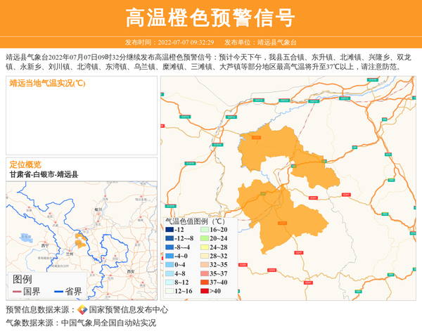 靖远县气象台2022年07月07日09时32分继续发布高温橙色预警信号:预计今天下午,我县五合镇、东升镇、北滩镇、兴隆乡、双龙镇、永新乡、刘川镇、北湾镇、东湾镇、乌兰镇、糜滩镇、三滩镇、大芦镇等部分地区最高气温将升至37℃以上,请注意防范。 信息来源:国家预警信息发布中心; 发布单位:靖远县气象台。