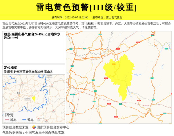 雷山县气象台2022年7月7日11时02分发布雷电黄色预警信号:预计未来3小时我县望丰、丹江、大塘等乡镇将发生雷电活动,可能会造成雷电灾害事故,并伴有短时强降水、大风等强对流天气,请注意防范。 信息来源:国家预警信息发布中心; 发布单位:雷山县气象台。