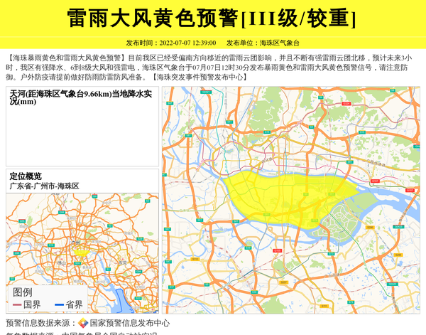 【海珠暴雨黄色和雷雨大风黄色预警】目前我区已经受偏南方向移近的雷雨云团影响,并且不断有强雷雨云团北移,预计未来3小时,我区有强降水、6到8级大风和强雷电,海珠区气象台于07月07日12时30分发布暴雨黄色和雷雨大风黄色预警信号,请注意防御。户外防疫请提前做好防雨防雷防风准备。【海珠突发事件预警发布中心】 信息来源:国家预警信息发布中心; 发布单位:海珠区气象台。