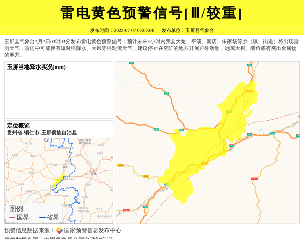 玉屏县气象台7月7日03时03分发布雷电黄色预警信号:预计未来3小时内我县大龙、平溪、新店、朱家场等乡(镇、街道)将出现雷雨天气,雷雨中可能伴有短时强降水、大风等强对流天气,建议停止在空旷的地方开展户外活动,远离大树、墙角或有突出金属物的地方。 信息来源:国家预警信息发布中心; 发布单位:玉屏县气象台。