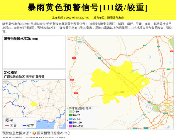 隆安县气象台2022年7月5日20时27分更新发布暴雨黄色预警信号:14时以来隆安县雁江、城厢、南圩、乔建、布泉、都结等乡镇已出现50-110毫米的强降雨,预计未来6小时,隆安县仍将有10到30毫米,局地40毫米以上的强降雨,山洪地质灾害气象风险大,请防范。 信息来源:国家预警信息发布中心; 发布单位:隆安县气象台。