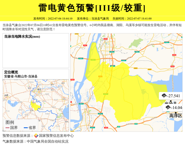 当涂县气象台2022年07月06日18时41分发布雷电黄色预警信号。6小时内我县塘南、湖阳、乌溪等乡镇可能发生雷电活动,并伴有短时强降水等对流性天气,请注意防范! 信息来源:国家预警信息发布中心; 发布单位:当涂县气象局。