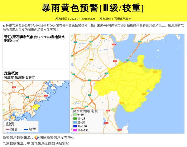 石狮市气象台2022年07月06日01时00分发布暴雨黄色预警信号:预计未来6小时内我市部分镇街降雨量将达50毫米以上。请注意防范局地强降水引发的城市内涝等次生灾害! 信息来源:国家预警信息发布中心; 发布单位:石狮市气象台。