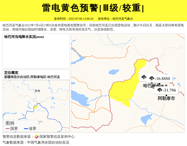 哈巴河县气象台2022年7月6日12时8分发布雷电黄色预警信号:目前哈巴河县已出现雷电活动,预计今日白天,我县大部仍将有雷电活动,局地可能出现短时强降水、冰雹、阵性大风等强对流天气,注意加强防范。 信息来源:国家预警信息发布中心; 发布单位:哈巴河县气象台。