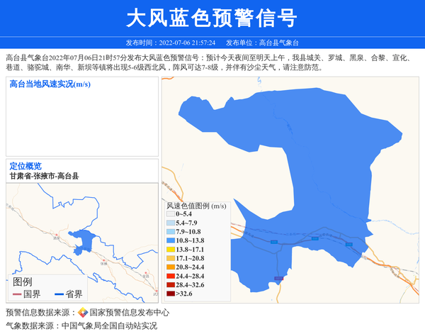 高台县气象台2022年07月06日21时57分发布大风蓝色预警信号:预计今天夜间至明天上午,我县城关、罗城、黑泉、合黎、宣化、巷道、骆驼城、南华、新坝等镇将出现5-6级西北风,阵风可达7-8级,并伴有沙尘天气,请注意防范。 信息来源:国家预警信息发布中心; 发布单位:高台县气象台。