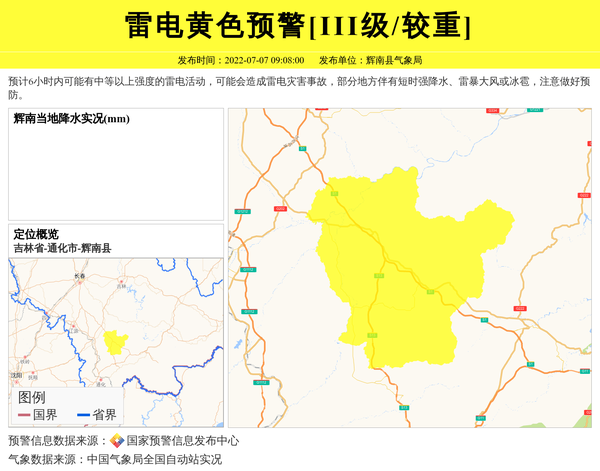 预计6小时内可能有中等以上强度的雷电活动,可能会造成雷电灾害事故,部分地方伴有短时强降水、雷暴大风或冰雹,注意做好预防。 信息来源:国家预警信息发布中心; 发布单位:辉南县气象局。