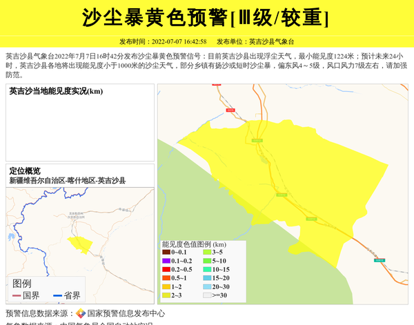 英吉沙县气象台2022年7月7日16时42分发布沙尘暴黄色预警信号:目前英吉沙县出现浮尘天气,最小能见度1224米;预计未来24小时,英吉沙县各地将出现能见度小于1000米的沙尘天气,部分乡镇有扬沙或短时沙尘暴,偏东风4~5级,风口风力7级左右,请加强防范。 信息来源:国家预警信息发布中心; 发布单位:英吉沙县气象台。