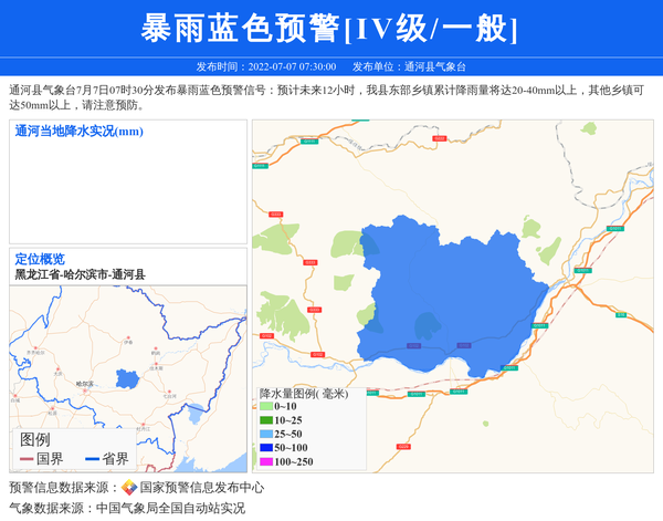 通河县气象台7月7日07时30分发布暴雨蓝色预警信号:预计未来12小时,我县东部乡镇累计降雨量将达20-40mm以上,其他乡镇可达50mm以上,请注意预防。 信息来源:国家预警信息发布中心; 发布单位:通河县气象台。