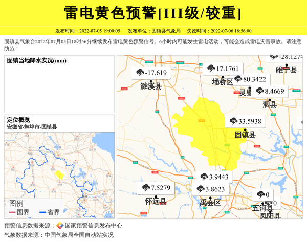 固镇县气象台2022年07月05日18时56分继续发布雷电黄色预警信号。6小时内可能发生雷电活动,可能会造成雷电灾害事故。请注意防范! 信息来源:国家预警信息发布中心; 发布单位:固镇县气象局。